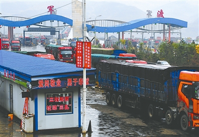 山西省离军高速军渡煤焦管理站前停满办票车辆(11月7日摄)。在收费站不足300米的距离里,共设置了超限监测站、收费站、动植物检验检疫站、煤焦管理站4个站点,每辆运煤车在手续完全正常的情况下最短也需要5分钟才能通过。
