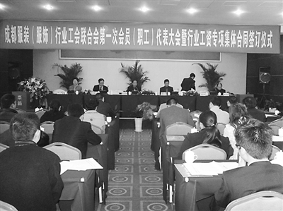 11月18日,成都服装(服饰)行业工会联合会宣告成立,新当选的工会联合会主席与成都服装(服饰)行业协会会长签订了《成都服装(服饰)行业工资专项集体合同》,为该行业21万名员工的权益提供了法律保障。据悉,成都服装(服饰)行业拥有127家企业、4个工业园区和9所服装院校。本报记者 高柱 摄