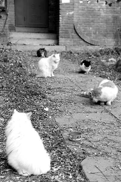 杂货铺后边的院子里,常常有五六只猫等着喂食,很多学生和住在燕南园里的人吃完饭,就顺路来这里喂猫。那个下午,六只猫在院子里晃晃荡荡,前后不过一刻钟的时间,就来了四拨人探望它们。其中有一对母子,儿子高高大大的,手里拿着一盒炸鸡肉块,妈妈用手把鸡肉块掰成小块儿,一边喂着一边叨咕着:“谁在呼噜呼噜的,干嘛呐跟那儿?”仔细看看原来是一只小猫,贪吃了太大一块卡住了嗓子,“哎呦,小可怜儿,怎么这么着急啊。”一边说着,她一边轻拍着小猫的背。旁边的儿子一直端着装鸡肉块的小盒,一脸无奈的神情看着自己的妈妈。喂到最后,还剩下一块,“这块我吃了啊。”说着,儿子一口吃掉了最后一块,“嘿,你这怎么还跟猫抢上了。”