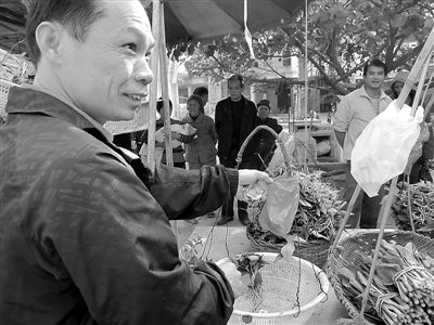 赶集的村民陆续来到菜摊前选菜,十分钟左右,几篮子小白菜、菜心就“抢购一空”了。