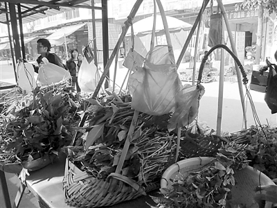 在菜篮子上面,有的绑着小布袋,有的系着小塑料袋,有的挂着竹编的小笼子,写着“一把一块”的纸片立在菜篮子的篮柄上。