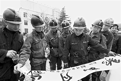 11月27日,四川省广安市华蓥山矿区绿水洞煤矿矿工,在欣赏书法家现场创作并赠送的书法作品。11月26日至27日是“双休日”,四川省广安市美术书法家协会和摄影家协会的20多名骨干会员,放弃休息时间,自发组织到华蓥山矿区的绿水洞煤矿,主动与该矿的30多名书画、摄影爱好者“结对”传艺,培养矿区的艺术人才,活跃矿区的文化生活。邱海鹰 唐平 摄