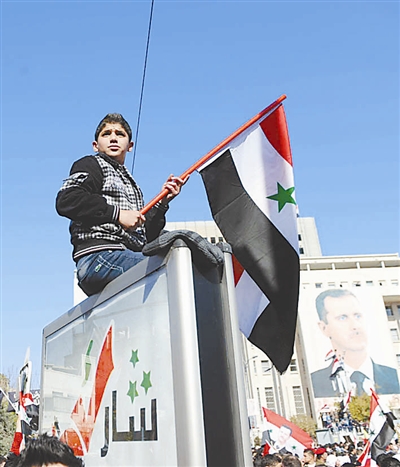 11月28日,一名男孩在叙利亚首都大马士革市中心的萨巴·巴赫拉特广场游行示威,抗议阿拉伯国家联盟(阿盟)对叙实施制裁的决定。 新华社记者 殷博古 摄