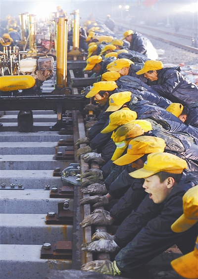 11月28日下午4时许,为迎接即将到来的春运,西安铁路局西安工务段调集300多工人,在狭窄、坎坷的道轨之间,用前边撬杠撬起、中间导轨滑轮支撑、后边大量人员肩扛手抬的办法,对陇海铁路正线零口车站的120号道岔进行更换。赵雄韬 摄