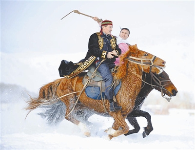 11月30日,在阿勒泰市拉斯特乡,哈萨克族牧民表演“姑娘追”。当日,“第九届中国·新疆·阿勒泰冰雪风情游”活动拉开帷幕,雪地叼羊、雪地赛马、雪地姑娘追等一系列民俗体育表演为活动增添了欢快的气氛,尽显新疆浓郁的冰雪风情。 新华社记者 沙达提 摄