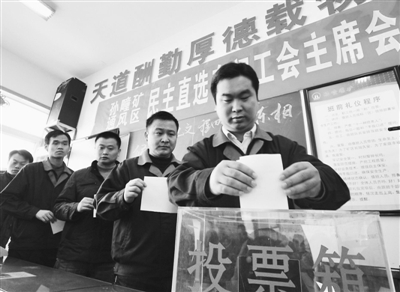 12月1日,安徽淮北矿业孙疃煤矿通风区234名职工齐聚会议室参加该区工会会员大会,直选车间工会主席。为进一步扩大基层民主、深化政务公开,该矿制定出台了选举办法和选举方案,按照个人申报、竞聘演讲、差额直选、组织考核、备案录用等程序,将职工认可的优秀代表选为“当家人”。王亮 摄