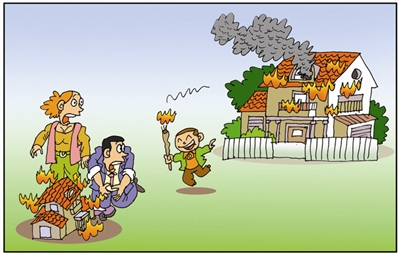 然而,回顾人类文明发展进程,我们也遗憾地看到,有些不切合实际的“臆想”仍然活在我们的日常生活里。正如我们在这幅漫画里看到的,祭祀先人的很多陋习不仅没有消失,反而在一定范围内被“放大”。愚昧和陋习也在与时俱进,以前人们烧纸,现在已经“升级”为烧“别墅”、“烧车”了。如果说这种“进化”还有一些喜剧成分的话,那么孩子的模仿就有悲剧色彩了——他竟然把真房子烧给“爷爷、奶奶”了;如果说父母的行为更多体现在“传承”,孩子的举动无异于大胆的“创新”了。无论先人、今人还是后来人,都有自己特有的想象力。