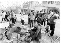 11月26日,在中疃镇张板桥村,一位外乡人正在村里爆米花。
