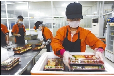 这是10月31日下午,西安捷星的中心厨房内,员工们正在进行配餐,装盒后立即送往订餐客户处。叶原 摄