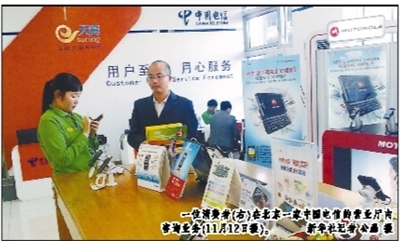 一位消费者(右)在北京一家中国电信的营业厅内咨询业务(11月12日摄)。新华社记者 公磊 摄