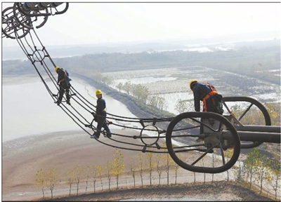 12月5日,在安徽省青阳县步岭村,电力职工正在90多米高空对世界首条空中“电力高速公路”——向家坝至上海±800千伏特高压直流输电线路安徽段的线路进行检修。