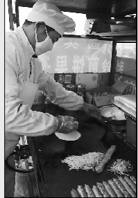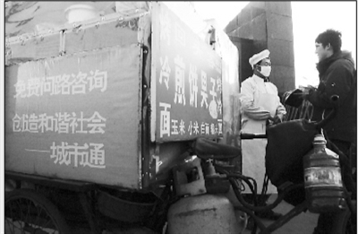 2008年,魏志勇开始帮着妻子撑起了这个煎饼摊。他的摊位恰好位于哈尔滨市南出口的必经之路,每天都有很多外地人从这里经过,问路的自然也多。魏志勇干脆就在煎饼摊上挂了一块免费指路的牌子:“免费问路咨询 创造和谐社会——城市通”。一年多来,魏志勇每天在经营小生意的同时,还为上百个外地人指明道路,他从不觉得麻烦和疲惫。他说,“这是我的乐趣,能帮助别人我也有成就感。”(本组图片均为新华社记者 王凯 摄)