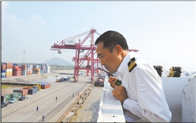 中国入世10年来,随着贸易量的不断增长,全国劳模、长江引航中心高级引航员姚泽炎的工作变得十分繁重,但他不敢有丝毫松懈。这是记者随老姚登船引航时拍摄,他正在指挥船舶靠泊南通港。