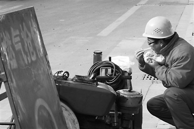 ▲燃气抢险队西区组组长郭旭春在施工地点吃饭(12月8日摄)。
