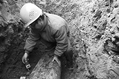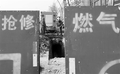 ▲12月8日,燃气抢险队西区组组员王新忠(右)和李军在开挖路面,准备对漏气的埋地管线进行抢修。