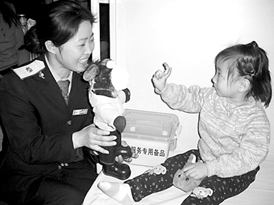 图为北京三队针对儿童旅客配备了玩具,实行无干扰服务,受到家长好评。陈有会 吕群富 摄