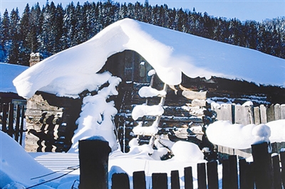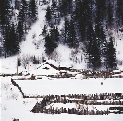 老房子外面的小院,都是用木栅栏围起来的,线条简洁而粗犷,如同一幅北大荒版画,自然天成。当栅栏的木枝披上银色外衣之后,则酷似一根根即将融化的奶油冰棍,与中间的“蛋糕”相映成趣。房顶、大地、山上隆起的雪堆和线条柔润如棉絮,洁白像陶塑银雕,在阳光映照下变幻万千,韵味无穷。