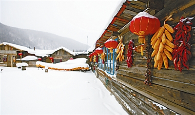 雪乡的街道上,马拉爬犁、狗拉雪橇、雪地摩托、卡丁车满街招摇,挑逗着游客们盎然的兴致;家家户户像过年一样大红灯笼高高挂,灯笼上赫然写着“好日子”三个金晃晃的大字,玉米棒子在木榼棱的房檐下闪烁着耀眼的光芒;木栅栏、柴火垛、酱缸、木梯子等院子里的家什都盖了一层白色的棉被。