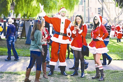 12月10日,数千名圣诞老人装扮的男女聚集在美国旧金山华盛顿广场,参加一年一度的圣诞老人聚会活动。 陈钢 供图