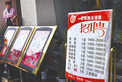 图为郑州市一家餐饮店门前贴出的招聘海报,底薪较往年相比提升了15%左右(12月13日摄)。