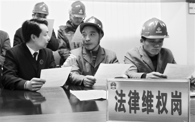 12月6日,安徽省蜀山区二里街社区为农民工开设“农民工维权绿色通道”,及时、高效地提高农民工的维权效率,降低农民工维权成本,确保农民工的“ 血汗钱”得到保障。图为律师现场给农民工讲解意外伤害赔偿以及讨薪维权等方面的知识。 韩苏原 摄