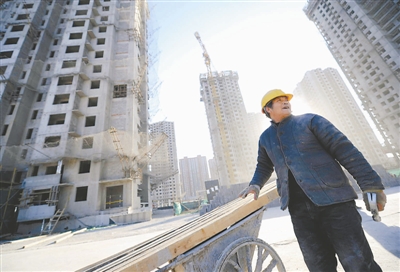 12月16日,工人在北京京原路7号公租房项目工地忙碌。