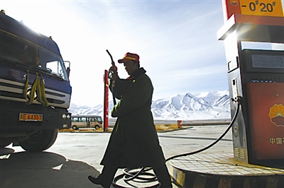 11月11日,在唐古拉山玉珠峰脚下,中国石油青海油田分公司职工颜全堂准备给过往的卡车加油。他所在的加油站海拔4100多米,现在他们加油站只有两个人。