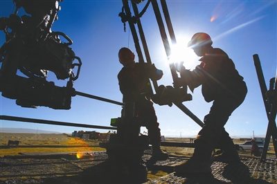 11月14日,在中国石油青海油田分公司昆北油田,钻井公司的工人正在进行修井作业。