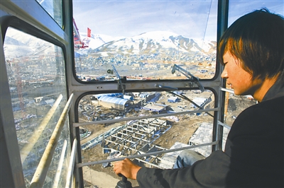 11月16日,在青海玉树,中国中铁建工集团的塔吊司机王浩天正在进行高空作业。近50米的塔吊,他每天要爬上爬下四趟。