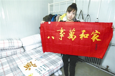 11月10日,在中铁五局兰新第二双线第一项目部的宿舍区,职工家属刘玲展示他的刺绣作品。她说既然已经来了,就应该把这里当成自己的家。
