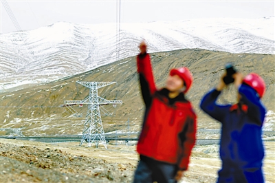 11月11日,在可可西里,青海电力公司的两位工人正在巡检线路。