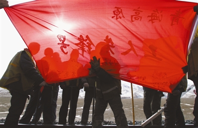 11月11日,在青藏铁路昆仑山口,几位铁路工人在一面青海高原“工人先锋号”旗帜上郑重签下自己的名字。一场声势浩大的争创青海高原“工人先锋号”活动正在青海高原开展得如火如荼。