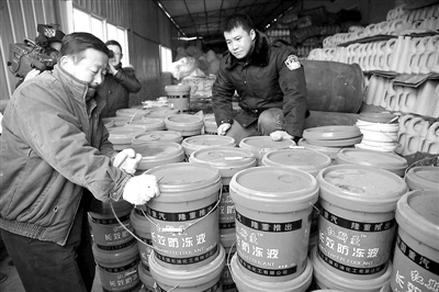 12月9日,沈阳市公安局在铁西区大潘镇查获1.2万桶无商标汽车防冻液和大量假冒国内某品牌防冻液,涉案价值67.2万元人民币。目前,此案在进一步审理中。 黄金昆 摄