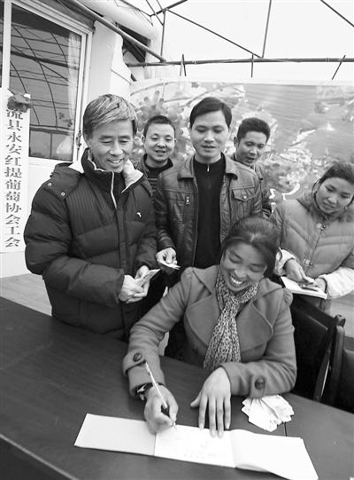 12月18日,四川省成都市双流县永安红提葡萄协会工会的会员在踊跃交纳会费。当日,双流县永安红提葡萄协会工会正式挂牌成立,该工会首批吸纳会员122人,遍及双流、新津、都江堰等6个县市。邱海鹰 摄