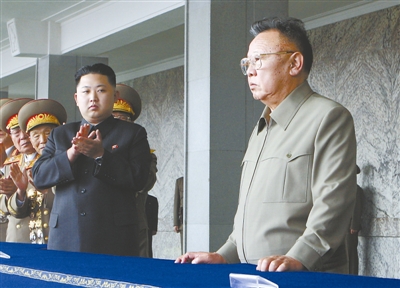 金正日资料照片:2010年10月10日,朝鲜在平壤金日成广场举行盛大阅兵式,庆祝朝鲜劳动党成立65周年。这是朝鲜最高领导人金正日(右一)等朝鲜党和国家领导人在阅兵式开始前走上主席台。右起第二人为金正恩。新华社记者 姚大伟 摄