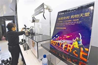 作为特殊的财税政策,国家赋予海南的针对境外旅客的“离境退税”和针对国人的“离岛免税”政策分别于今年1月和4月启动。图为12月19日,海口美兰机场免税店工作人员在布置货架商品。骆云飞 摄