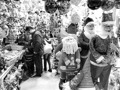 12月17日,江苏省无锡市塘南路招商城圣诞装饰商品热卖,前来挑选彩带、铃铛、圣诞老人、圣诞树、雪花片等圣诞饰品的顾客络绎不绝,尤其是年轻人购买得多。据了解,今年的圣诞节庆用品与去年相比价格涨幅近一成,到圣诞节前一个星期内是销售高峰期,买的人一天比一天多。戚善成 摄
