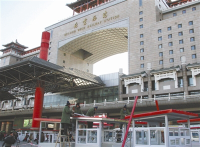 12月21日,在北京西站北广场,工作人员在搭建实名验票亭。