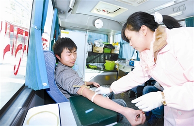 连日来,西藏拉萨血库“O”型、“B”型血告急,许多外来农民工来到设立在拉萨繁华街区的流动献血车上踊跃献血,缓解了血库的供血压力。新华社记者 文涛 摄