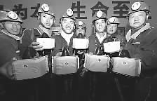 12月19日,安徽淮北矿业童亭煤矿为采掘、通风、防突等接触煤岩粉尘的1100余名班组员工送了一份“礼物”——自吸过滤式防尘呼吸器。该矿掘进班班长侯利民(右一)介绍说,与老式防尘口罩相比,这东西不仅轻盈小巧、佩带舒适,而且可以拆洗,能有效预防煤岩粉尘对矿工呼吸道及肺部的危害,体现了企业对咱矿工的关爱。图为当日大伙刚领到呼吸器的样子。 陈磊 摄