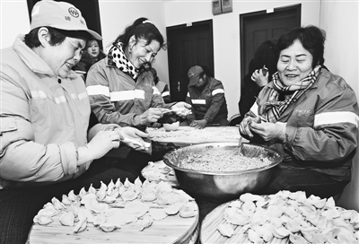 12月21日,保洁员在保洁员公寓包饺子。当日,西安市碑林区柏树林街办开展“情系保洁员,冬日送温暖”捐赠活动,他们不但在爱心企业——西安鸿星尔克捐助下,为辖区264名保洁员赠送价值3万元的棉衣,还与保洁员一起包吃饺子,喜气洋洋过冬至。袁景智 摄