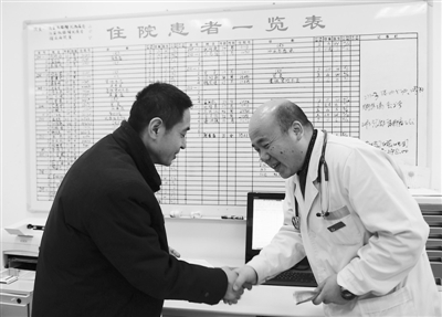 ①12月15日,患者何经涛(左)送还刘胜阳医生垫付的钱并表示感谢。
