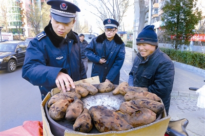 双方僵持着,“老王”害怕车被暂扣,何晓和宋志刚依例“说服教育”着,站在一旁的记者,看着这一幕,心下却忽然纠结起来。“看着挺可怜的,别真的就被扣了车子和白薯啊。”心里嘀咕着,终于,何晓发话,“走吧,别老堵在人家门口了。”