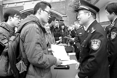 日前,上海铁路公安民警在上海松江大学城举办火车票实名制宣传活动。活动中,民警向学生宣讲实名制购票常识,并征求学生对铁路公安的意见建议,现场发放了《给高校师生的一封信》等宣传资料。目前,已有10所高校近2000名大学生与铁路民警进行了互动交流。图为民警正在向学生介绍防盗、防骗等安全出行常识。