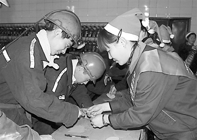 平安夜前夕,安徽淮北矿业袁庄煤矿妇女协安会组织12名职工戴上“圣诞帽”,来到矿井口开展“温馨平安夜,浓浓协安情”活动,为矿工兄弟们送去许愿卡、苹果、圣诞树等“平安祝福”。马利平 谢敏 摄