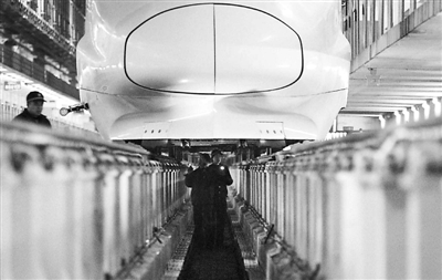 12月23日晚,南昌铁路车辆段动车所地勤机械师正在对动车组进行检修,以迎接即将到来的2012年春运。为满足广大旅客节日出行需求,南昌铁路局将增开多趟动车组及临客列车。连日来,南昌、福州车辆段动车所组织技术人员对昌九、武九、沪昆、福厦等高铁动车组进行“记名式”全面检、修、验,并执行24小时全天候作业。胡国林 苏贤达 摄