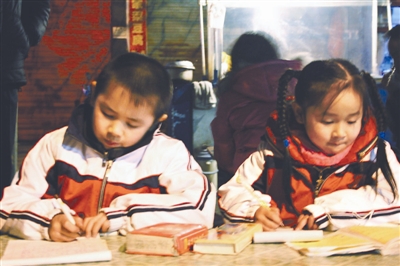 今年10岁的李发鹏正在写作文《难忘的一天》,小学一年级的妹妹李春淋正在练习生字。 孩子的爸爸李建云无可奈何地说:“这小摊只能在晚上摆,可晚上孩子要写作业,把孩子留家里不放心,再说孩子功课也需要辅导,只好让孩子在这儿写作业了。” 田德政 摄
