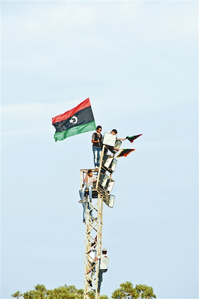 10月23日,在利比亚班加西烈士广场,人们在灯架上挥舞执政当局旗帜,庆祝全国解放。 新华社记者 李木子 摄
