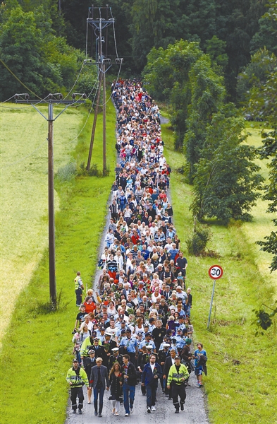 7月26日,挪威数千人参加在于特岛举行的遇难者祭奠仪式。CFP 供图