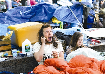 10月6日,在美国纽约曼哈顿的祖科蒂公园,两名抗议者面露疲惫。新华社记者 邓坚 摄